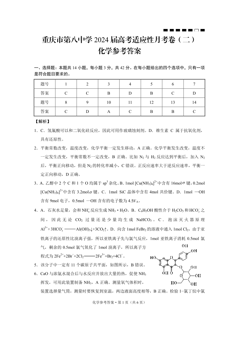 重庆市第八中学2024届高考适应性月考卷(二)化学答案