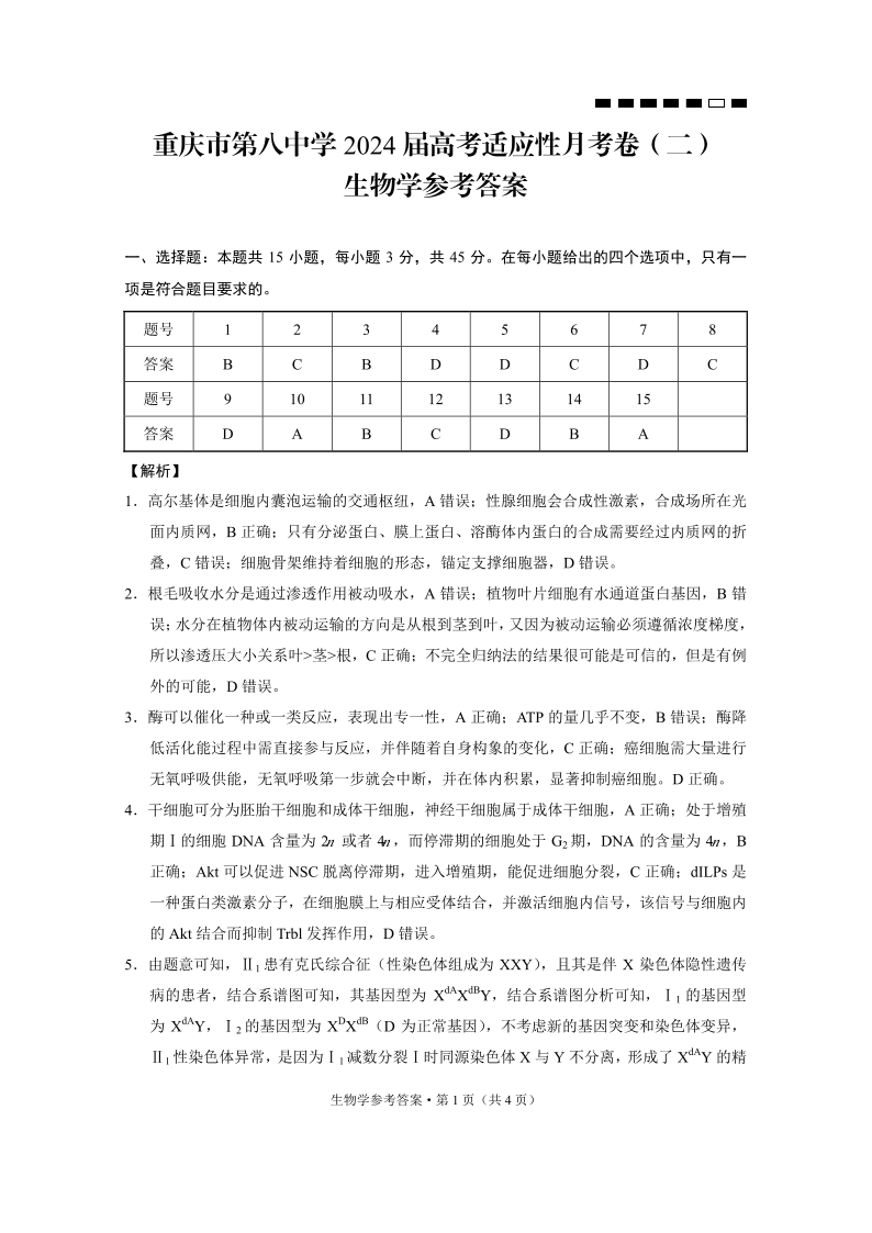 重庆市第八中学2024届高考适应性月考卷(二)生物答案
