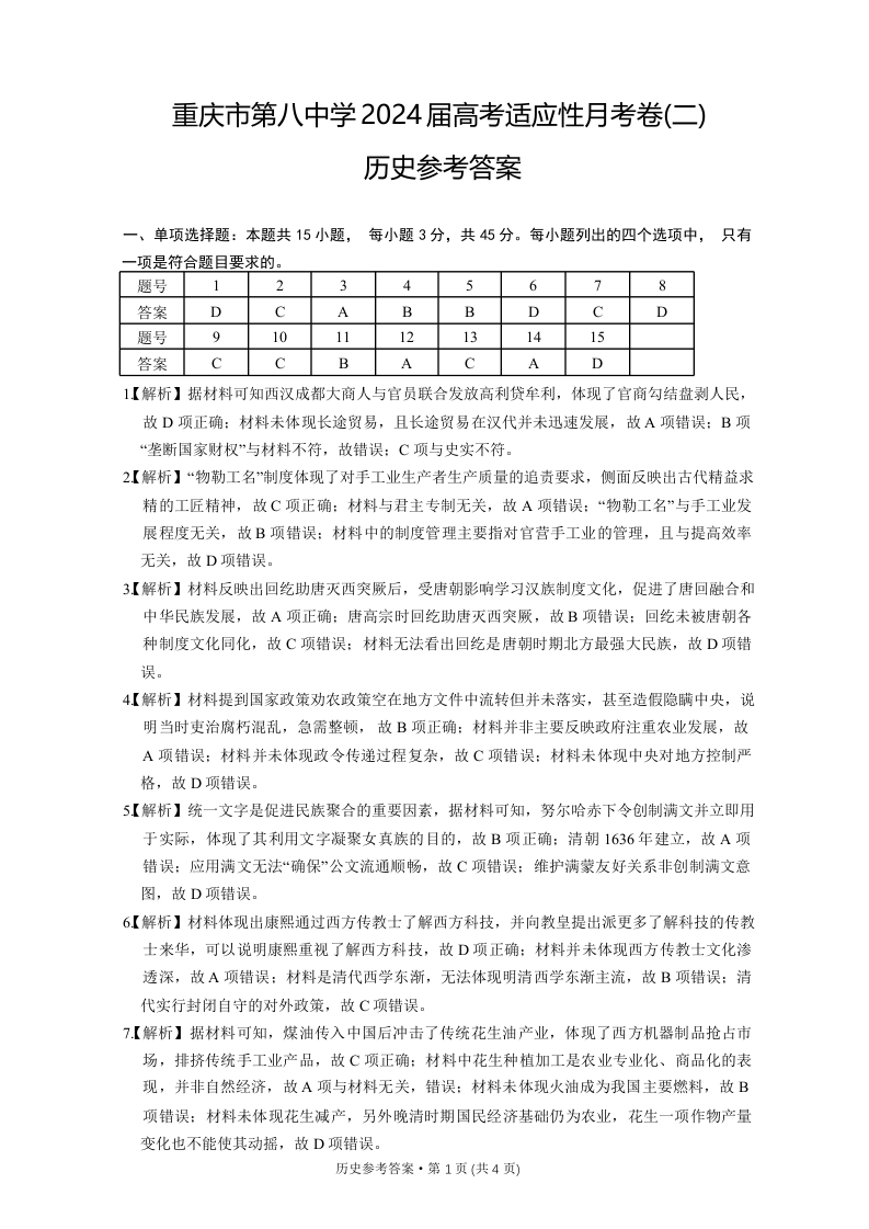 重庆市第八中学2024届高考适应性月考卷(二)历史答案