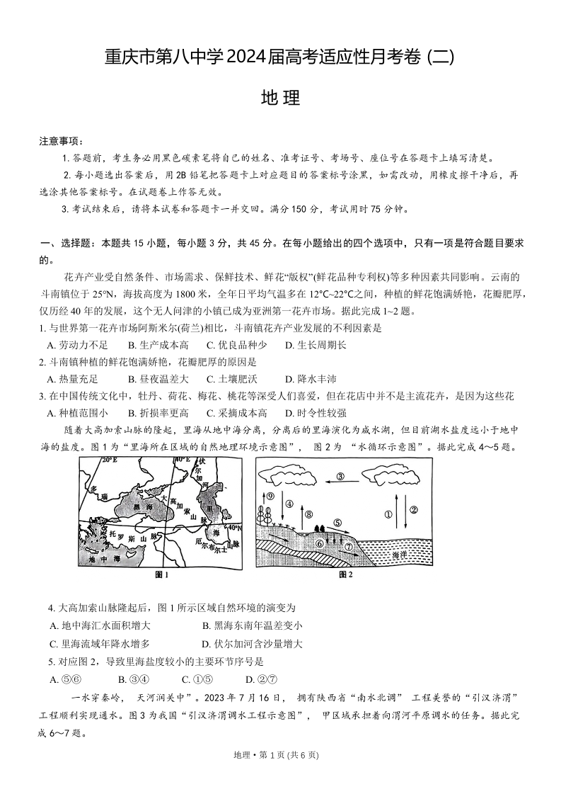 重庆市第八中学2024届高考适应性月考卷(二)地理