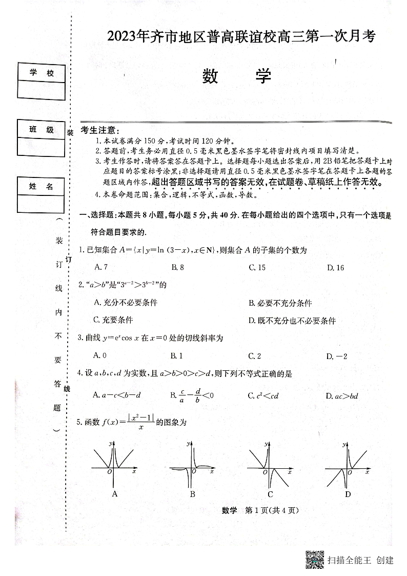黑龙江省齐齐哈尔市联谊校2024届高三上学期9月月考数学