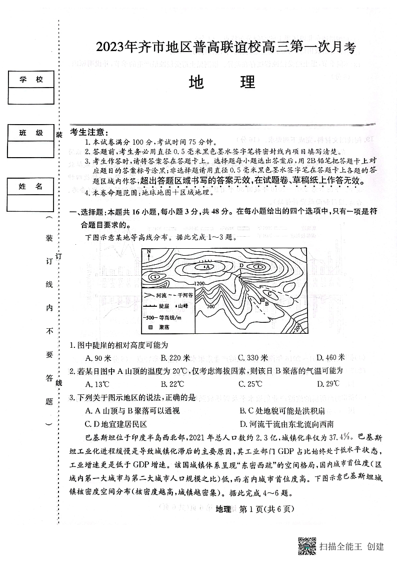 黑龙江省齐齐哈尔市联谊校2024届高三上学期9月月考地理