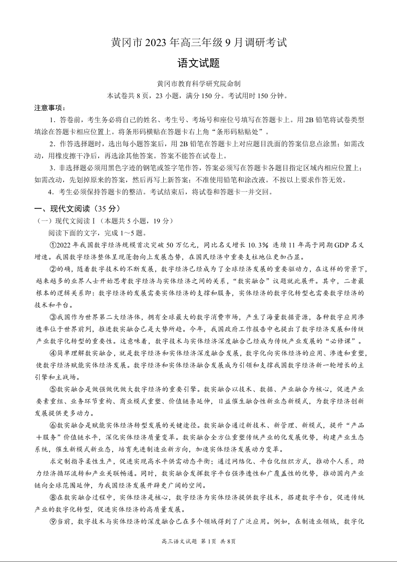 湖北省黄冈市2024届高三上学期9月调研考试语文
