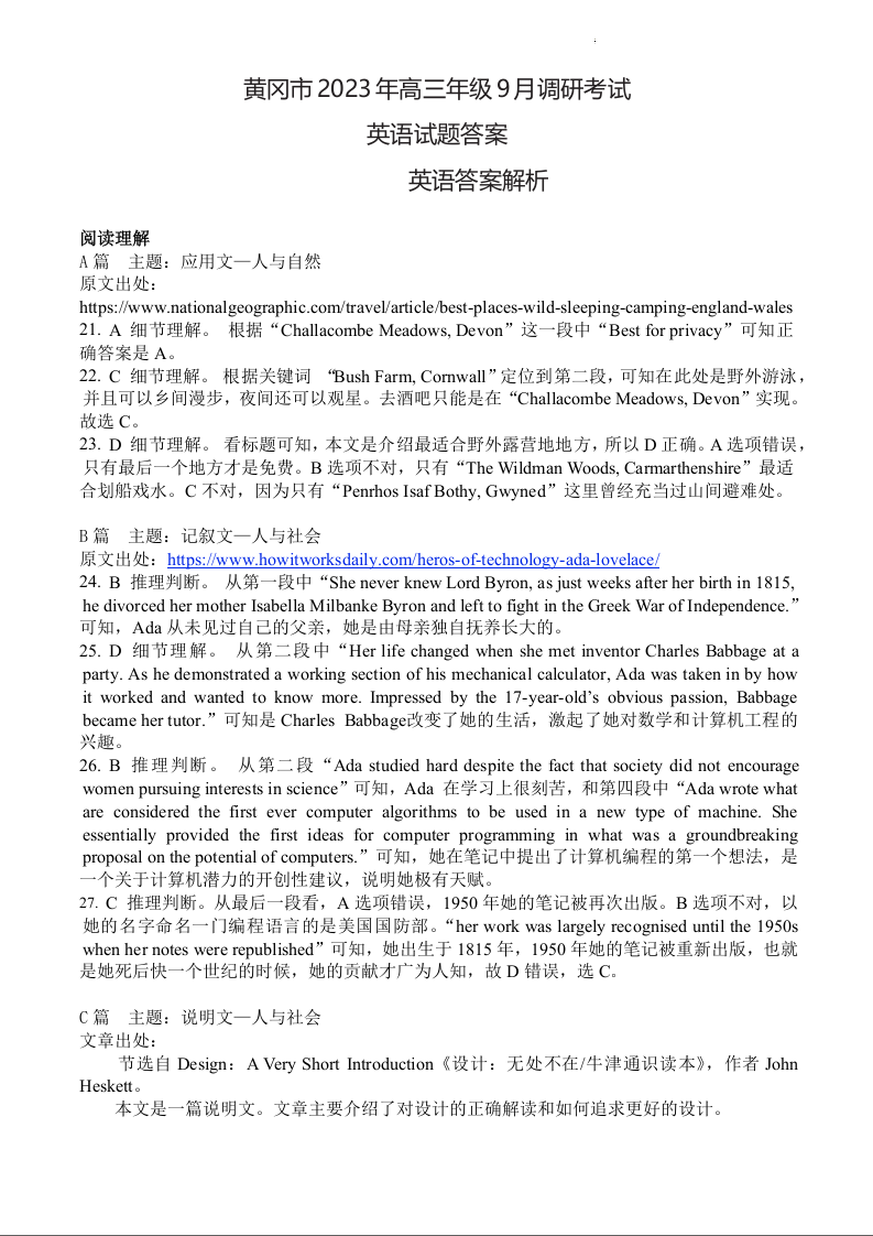 湖北省黄冈市2024届高三上学期9月调研考试英语答案