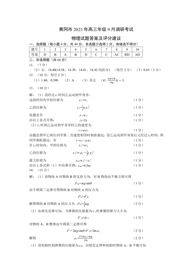 湖北省黄冈市2024届高三上学期9月调研考试物理答案