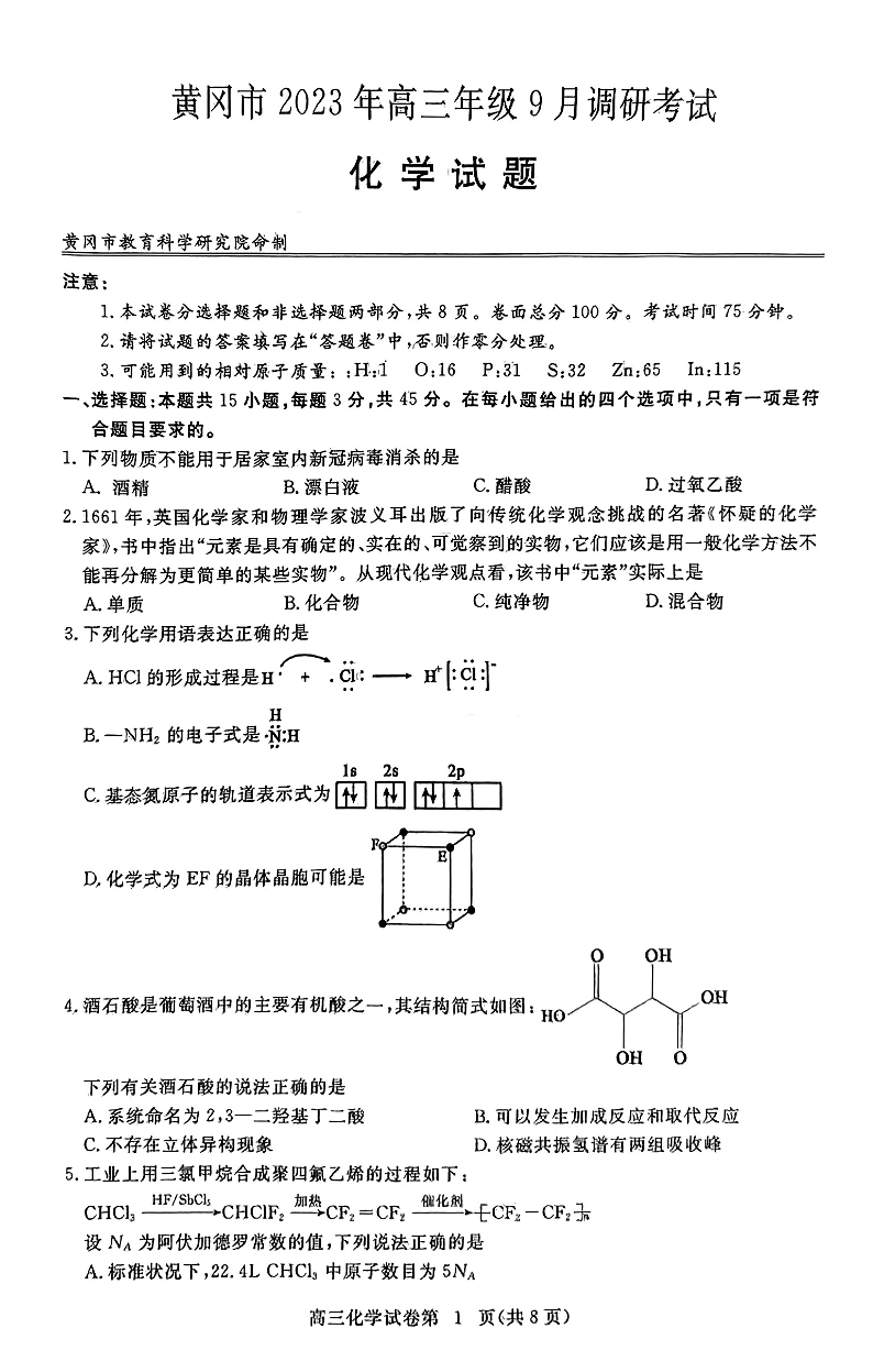 湖北省黄冈市2024届高三上学期9月调研考试化学