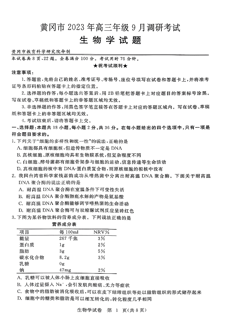 湖北省黄冈市2024届高三上学期9月调研考试生物