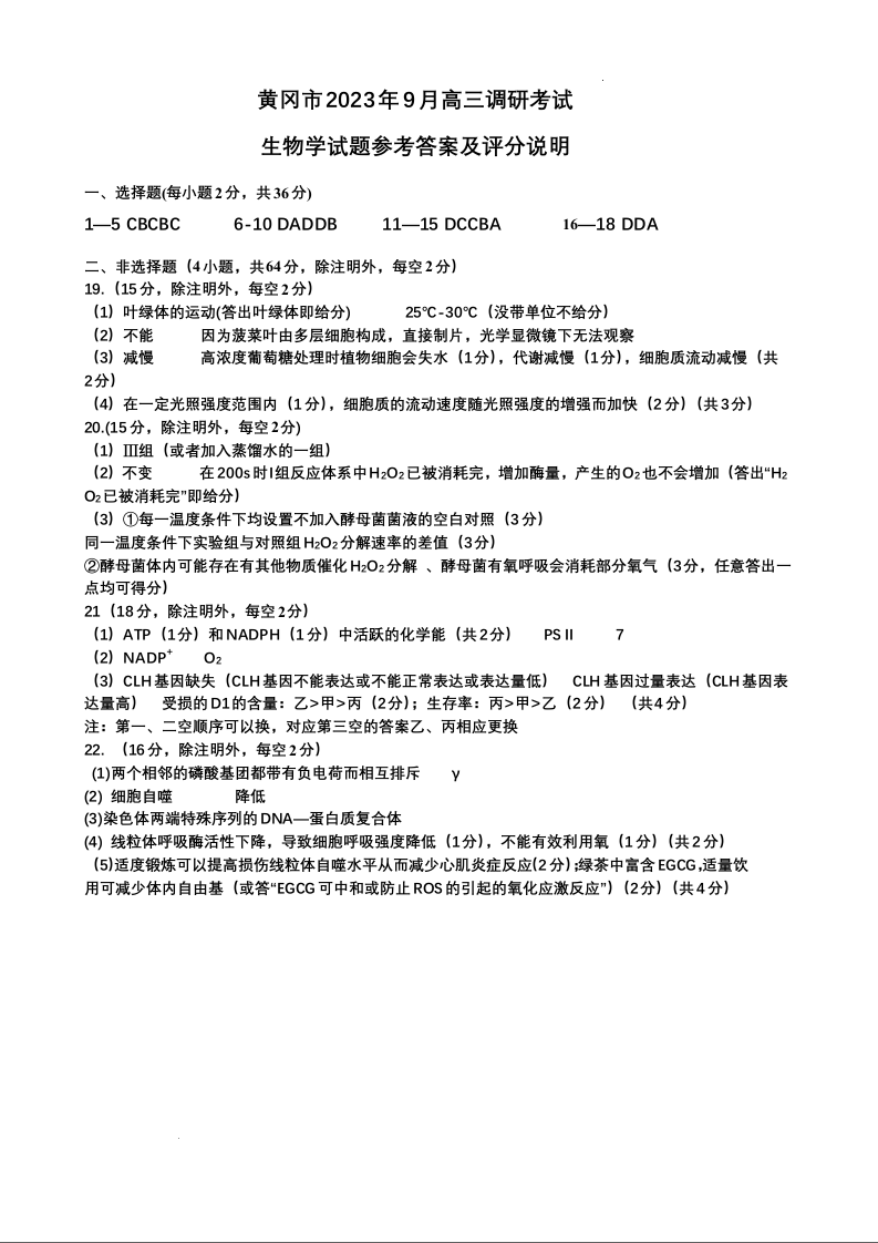 湖北省黄冈市2024届高三上学期9月调研考试生物答案