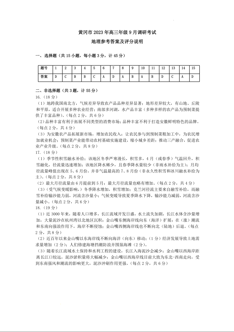 湖北省黄冈市2024届高三上学期9月调研考试地理答案
