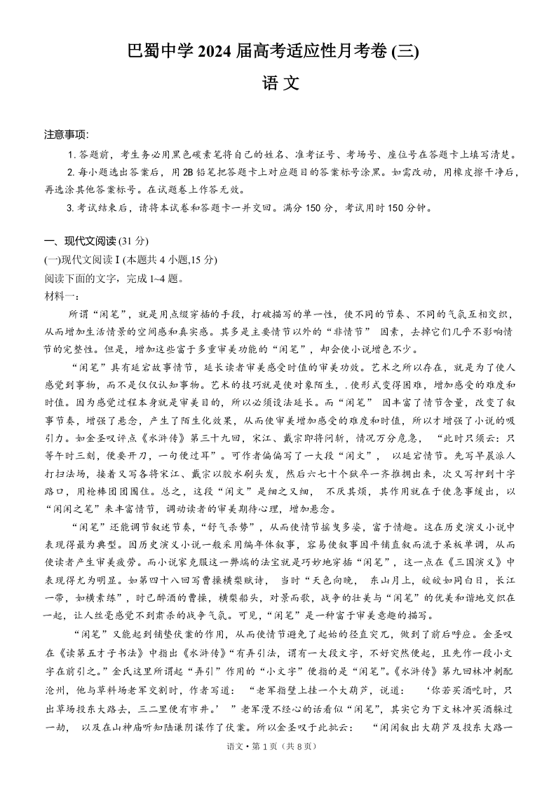 重庆巴蜀中学2024届高三适应性月考(三)语文