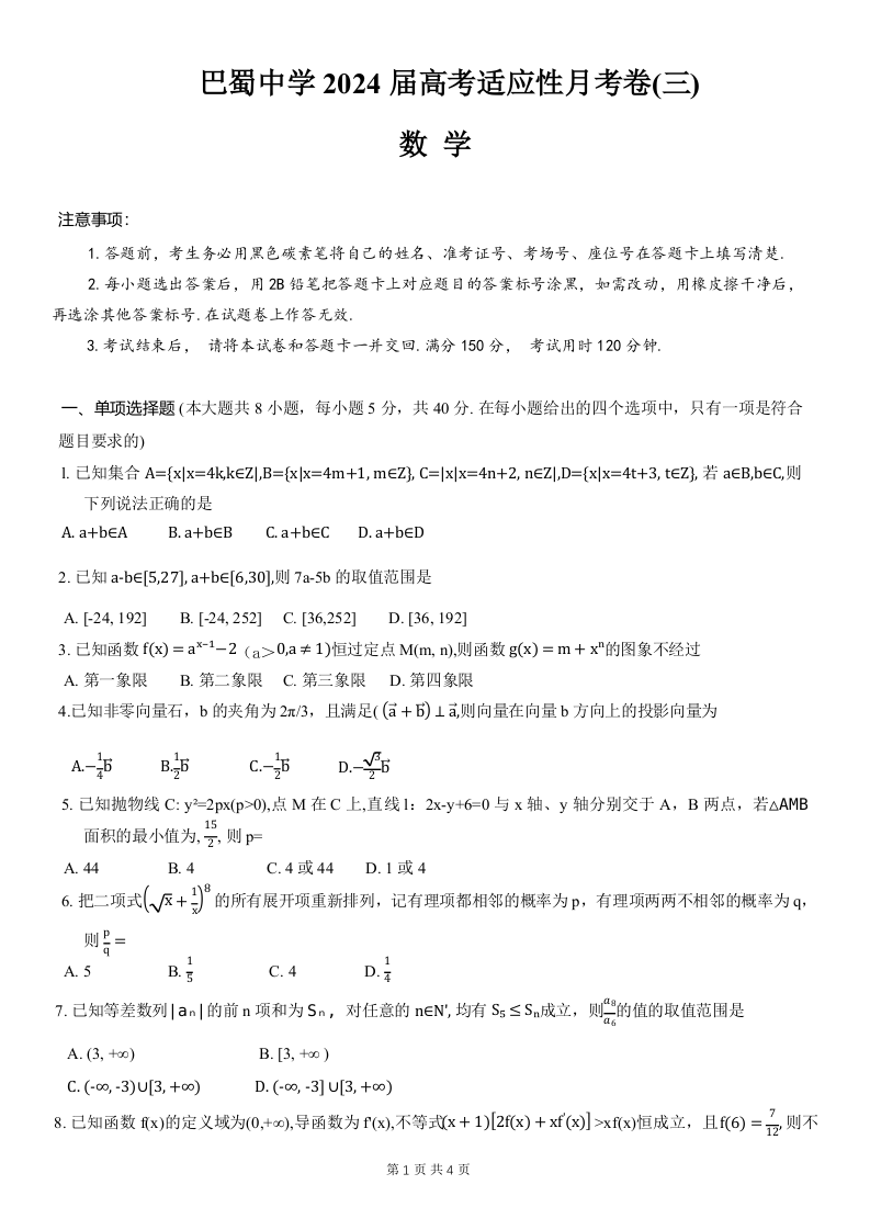 重庆巴蜀中学2024届高三适应性月考(三)数学
