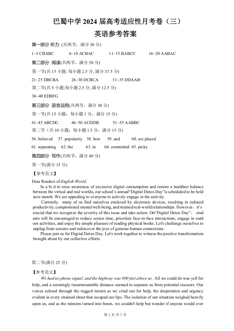 重庆巴蜀中学2024届高三适应性月考(三)英语答案
