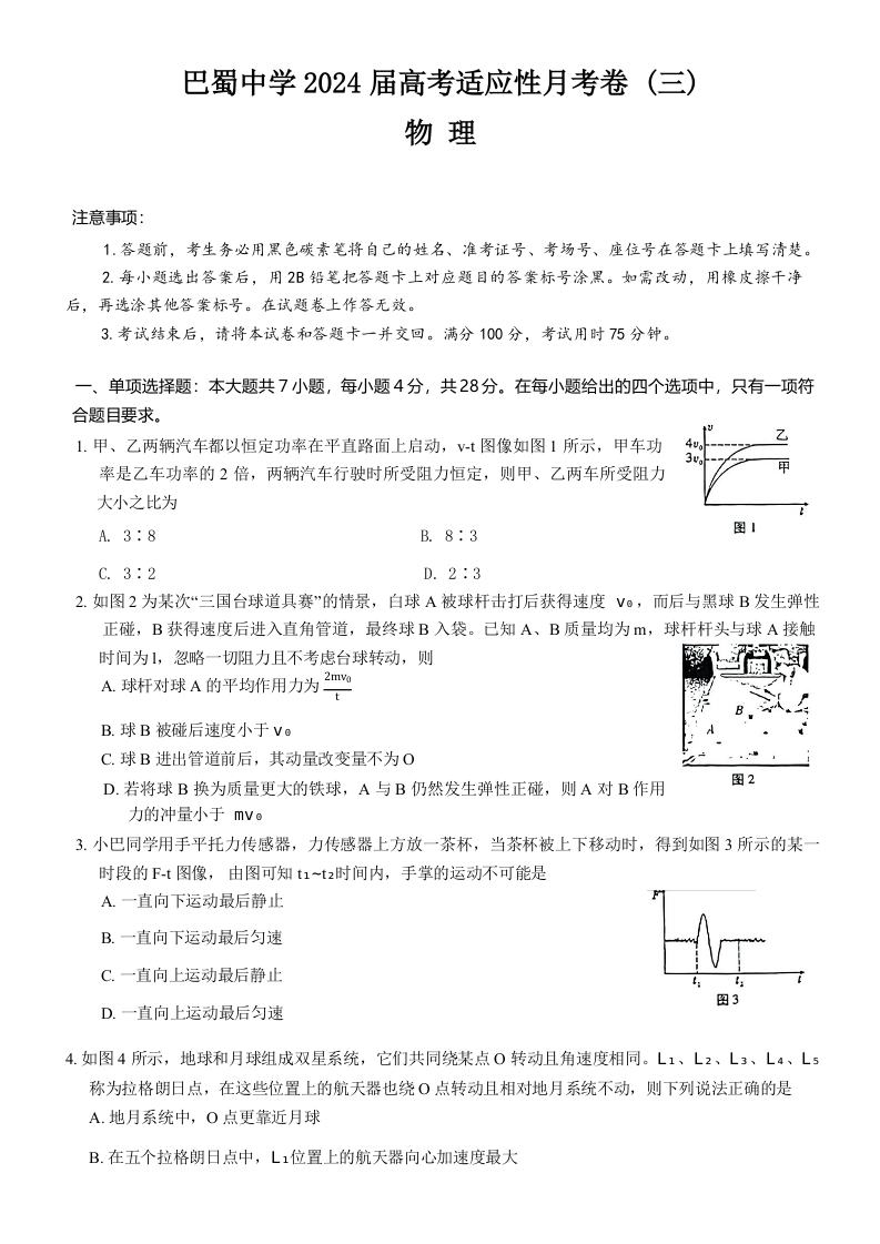 重庆巴蜀中学2024届高三适应性月考(三)物理