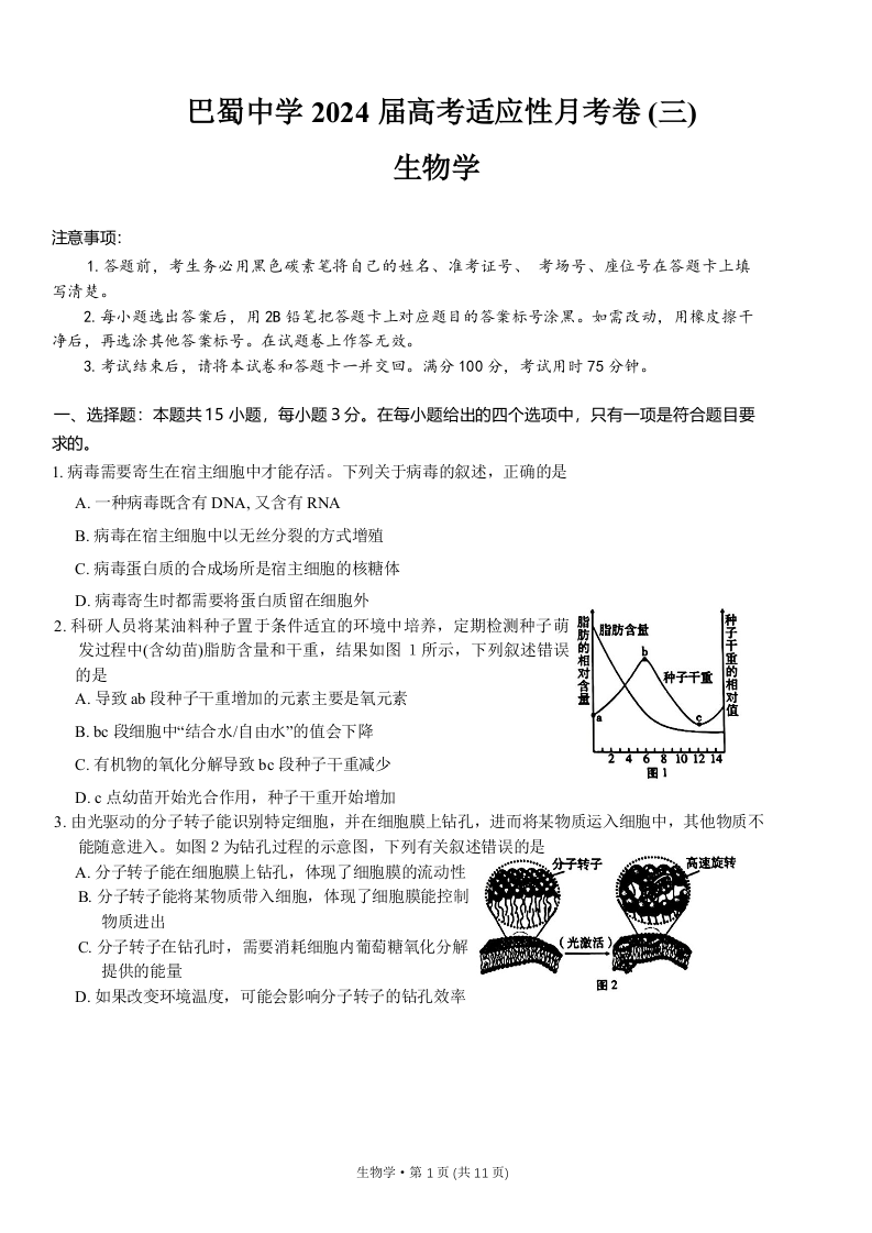 重庆巴蜀中学2024届高三适应性月考(三)生物