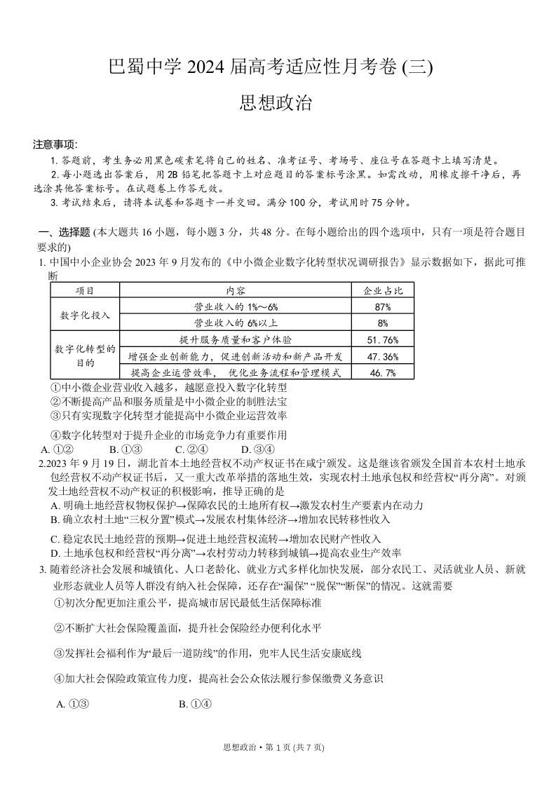 重庆巴蜀中学2024届高三适应性月考(三)政治