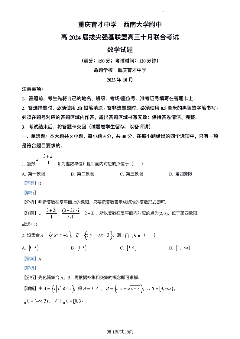 重庆育才中学西南大学附中高2024届拔尖强基联盟高三十月联合考试数学(精品解析版)