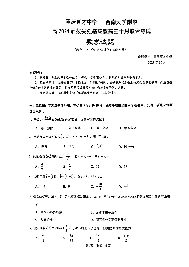 重庆育才中学西南大学附中高2024届拔尖强基联盟高三十月联合考试数学