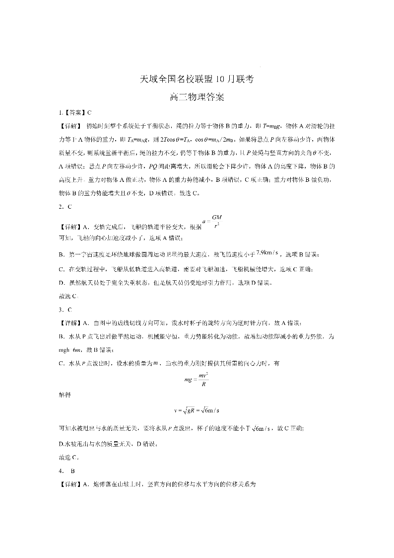 浙江省2024届第一学期天域全国名校协作体联考物理答案