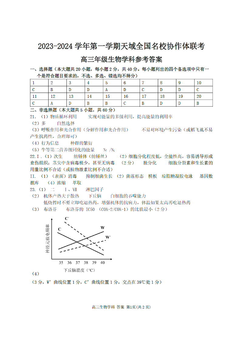 浙江省2024届第一学期天域全国名校协作体联考生物答案