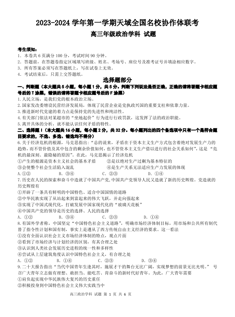 浙江省2024届第一学期天域全国名校协作体联考政治
