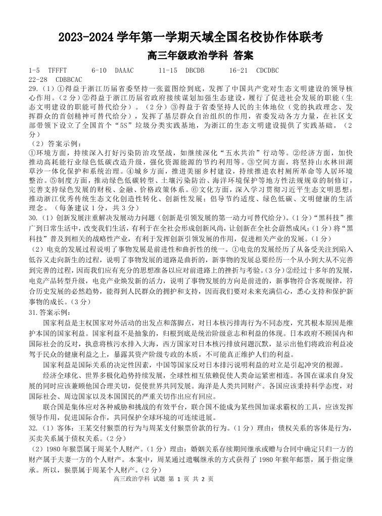 浙江省2024届第一学期天域全国名校协作体联考政治答案