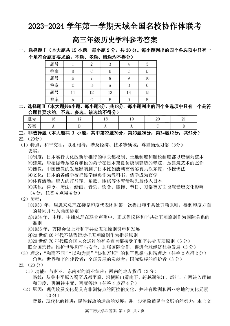浙江省2024届第一学期天域全国名校协作体联考历史答案