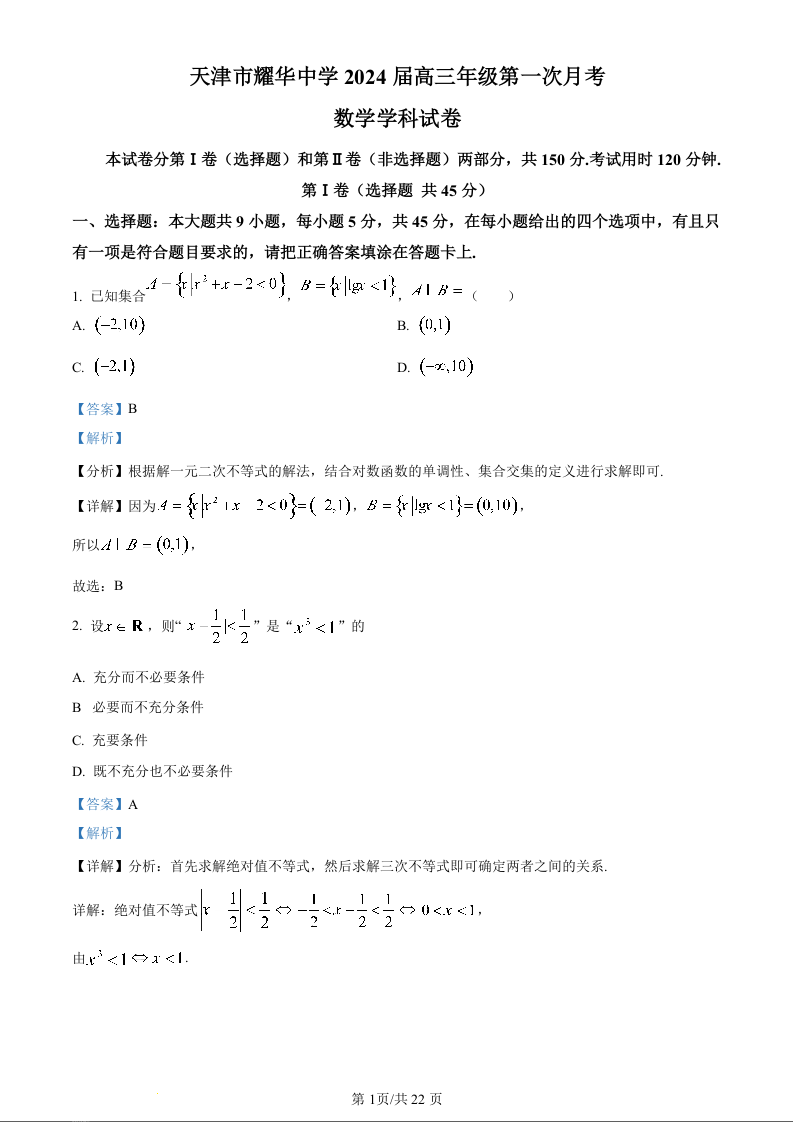 天津市耀华中学2024届高三上学期10月月考数学(解析版)
