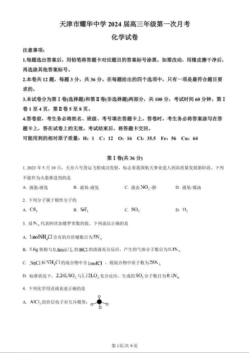 天津市耀华中学2024届高三上学期10月月考化学(原卷版)