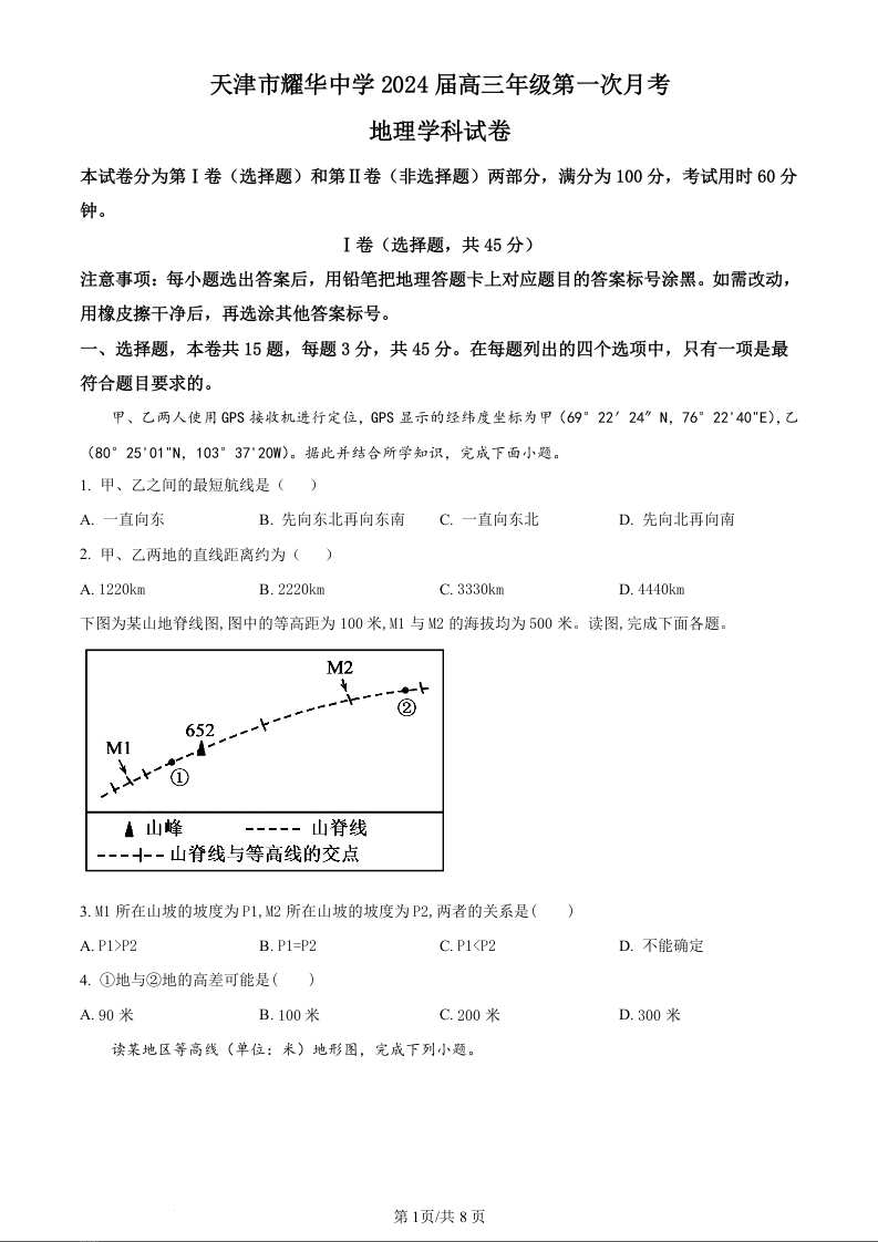 天津市耀华中学2024届高三上学期10月月考地理(原卷版)