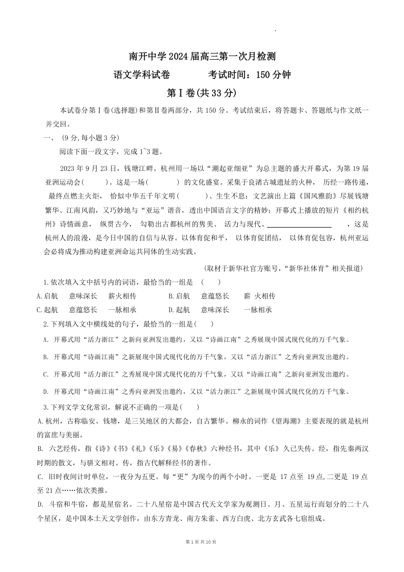 天津市南开中学2024届高三上学期第一次月考语文