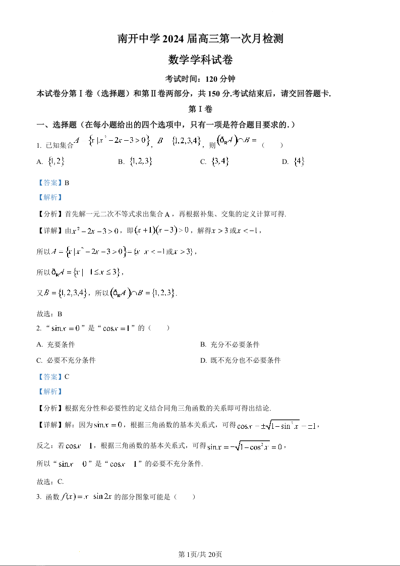 天津市南开中学2024届高三上学期第一次月考数学(精品解析版)