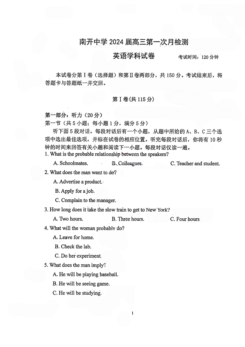 天津市南开中学2024届高三上学期第一次月考英语