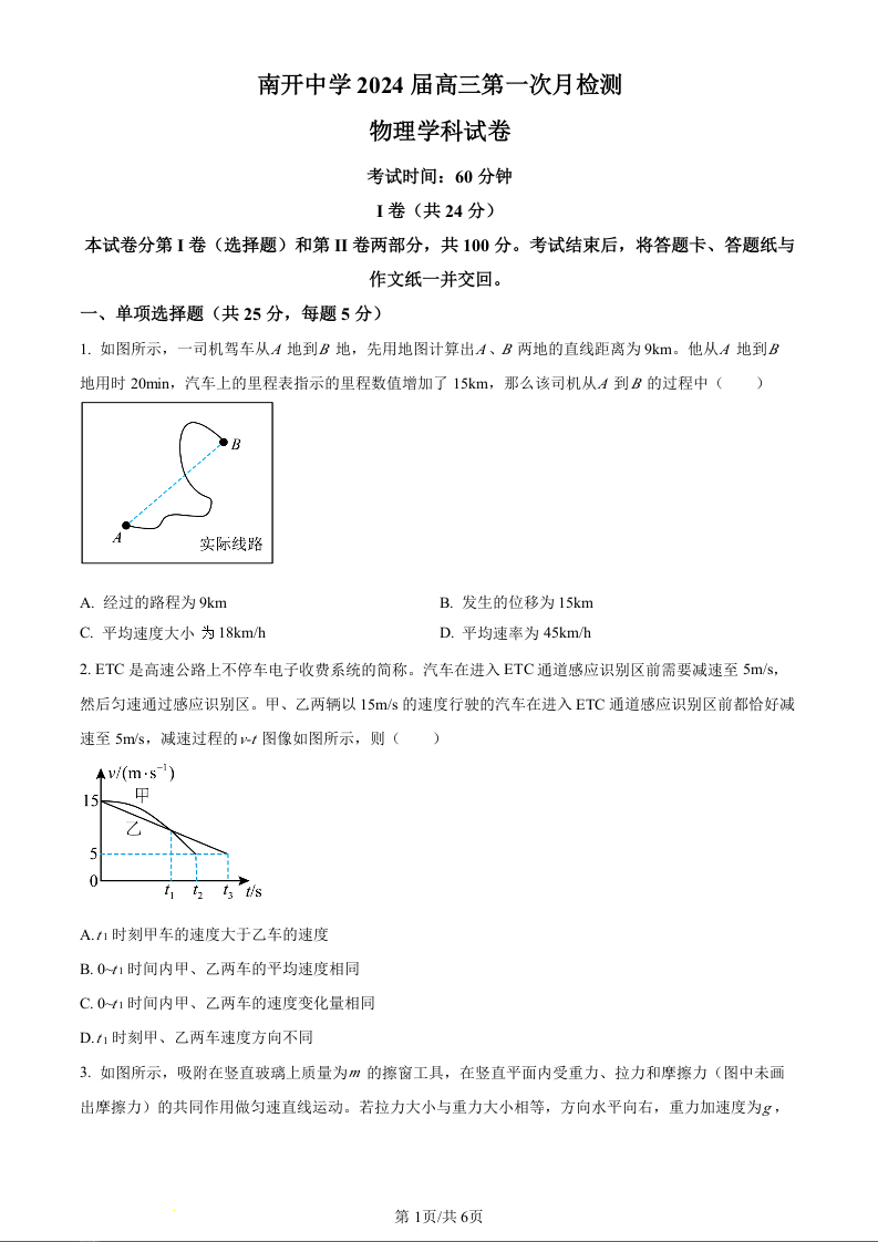 天津市南开中学2024届高三上学期第一次月考物理(原卷版)
