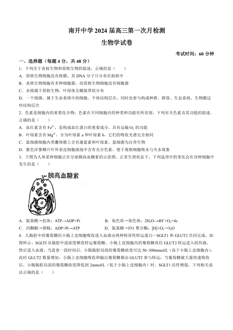 天津市南开中学2024届高三上学期第一次月考生物+答案