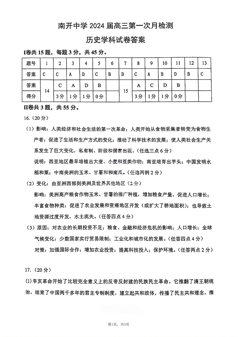 天津市南开中学2024届高三上学期第一次月考历史答案