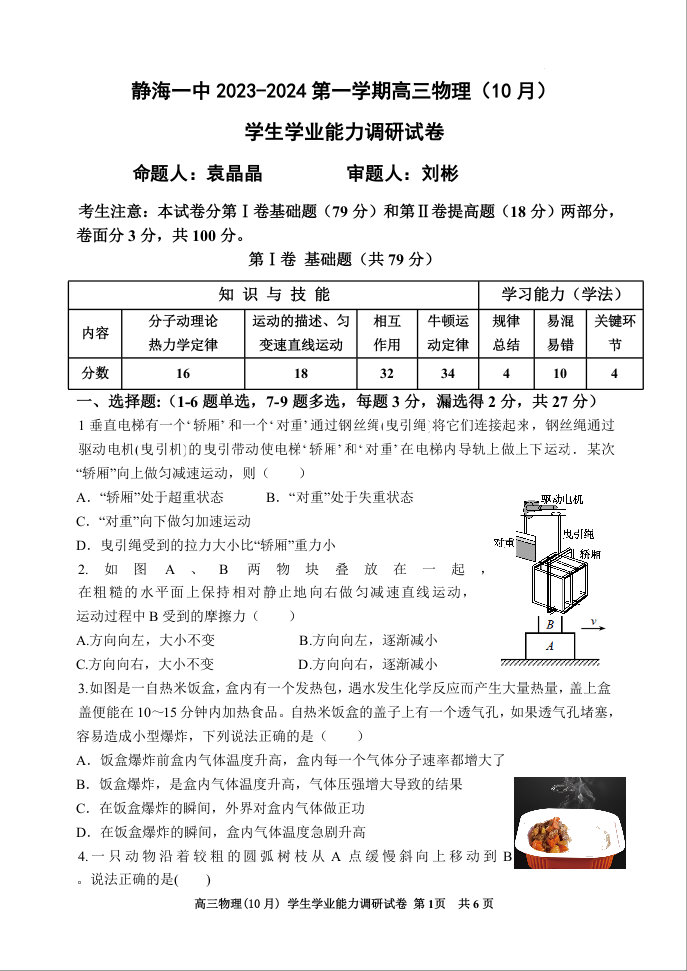 天津市静海区第一中学2024届高三上学期10月月考物理+答案