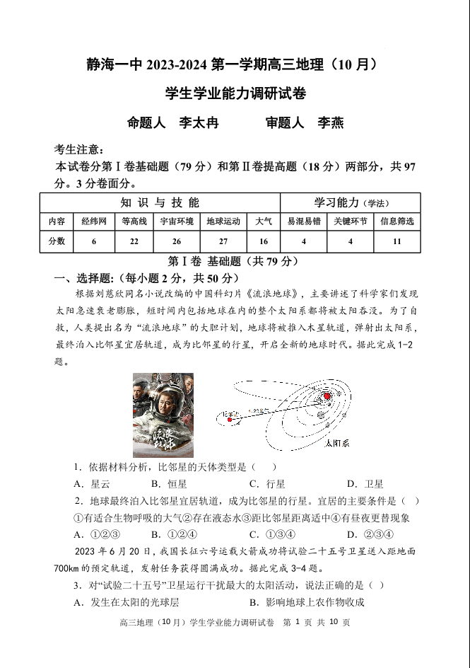 天津市静海区第一中学2024届高三上学期10月月考地理+答案