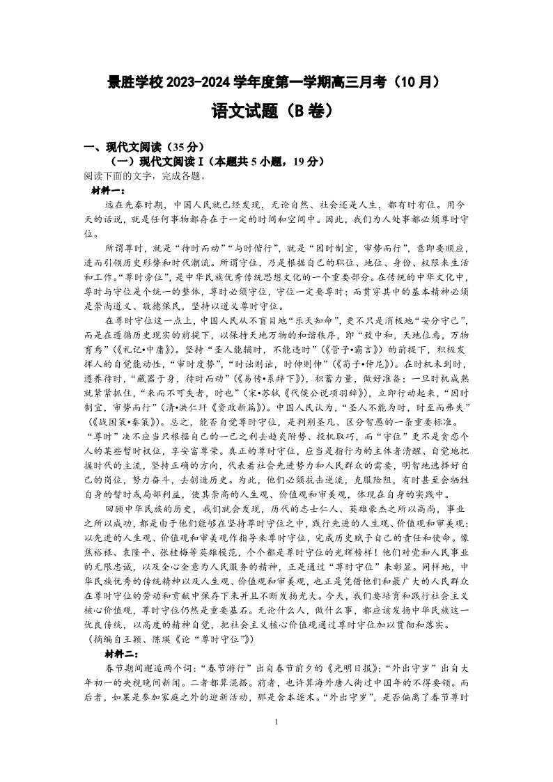山西省运城市景胜学校(东校区)2024届高三上学期10月月考(B)卷语文