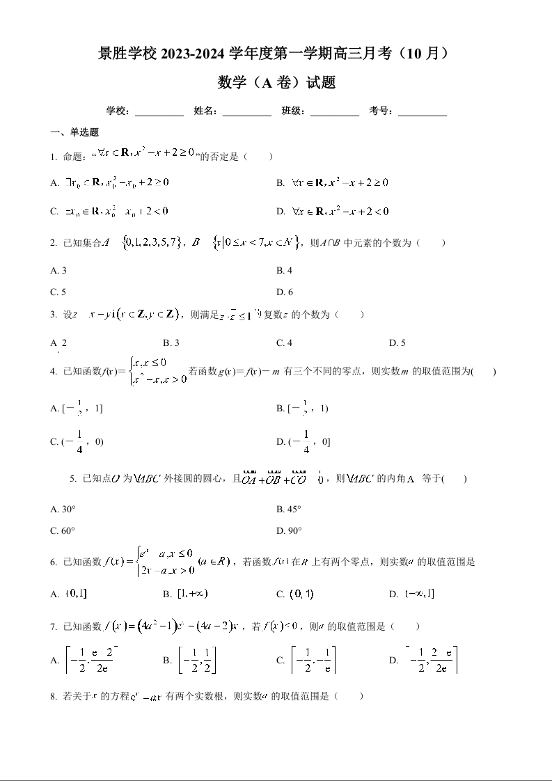 山西省运城市景胜学校(东校区)2024届高三上学期10月月考(A)卷数学(原卷版)