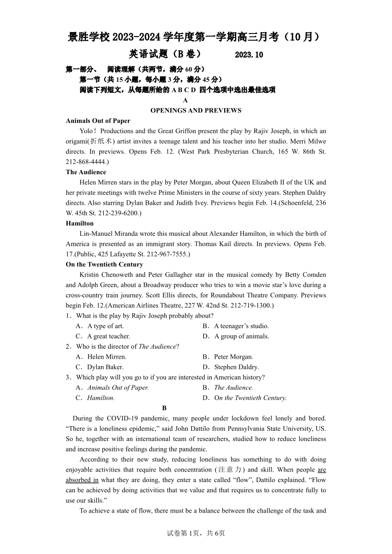 山西省运城市景胜学校(东校区)2024届高三上学期10月月考(A)卷英语