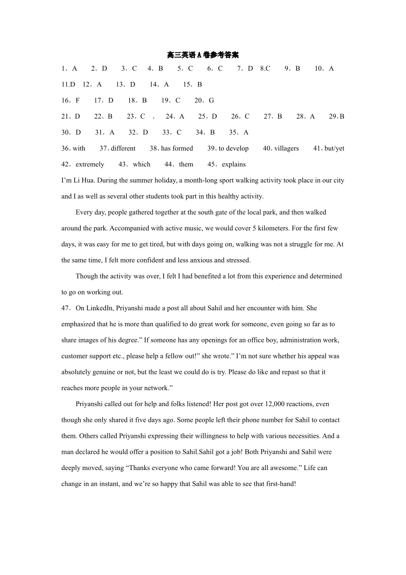 山西省运城市景胜学校(东校区)2024届高三上学期10月月考(A)卷英语答案
