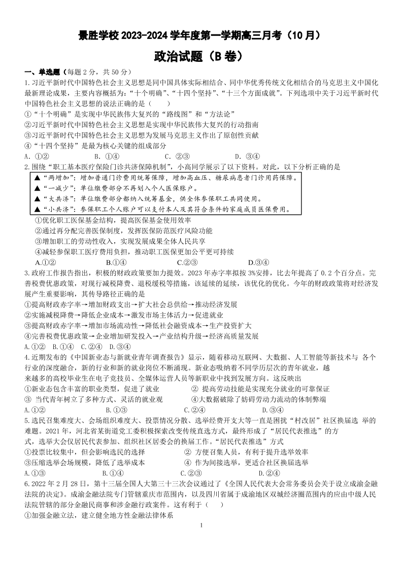山西省运城市景胜学校(东校区)2024届高三上学期10月月考(B)卷政治