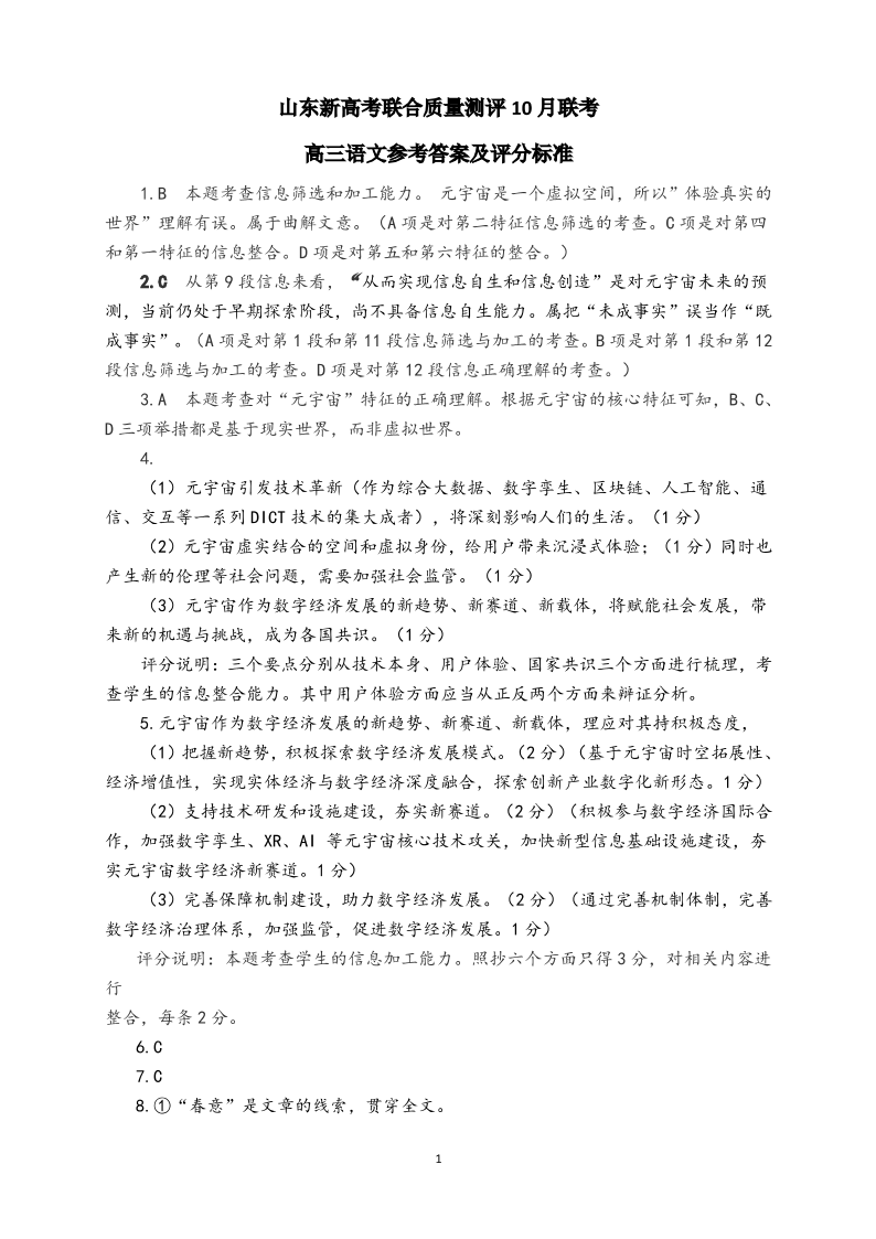 山东新高考联合质量测评2024届高三10月联考语文答案