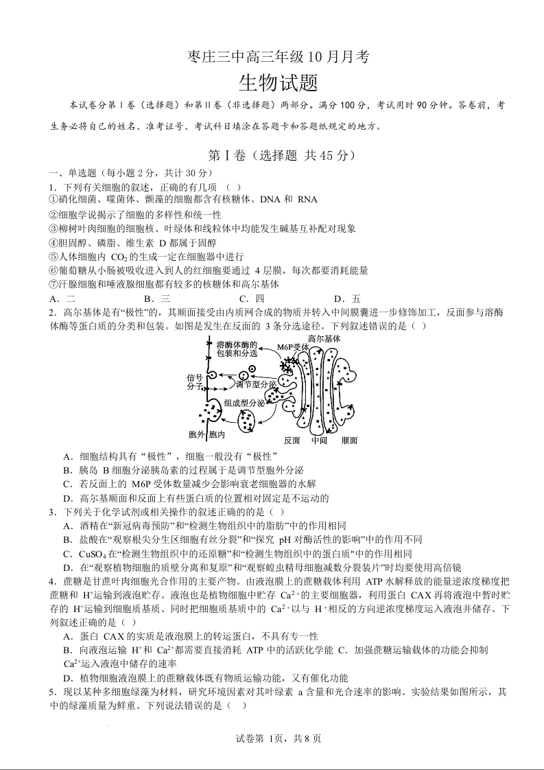 山东省枣庄市第三中学2024届高三上学期10月月考生物+答案
