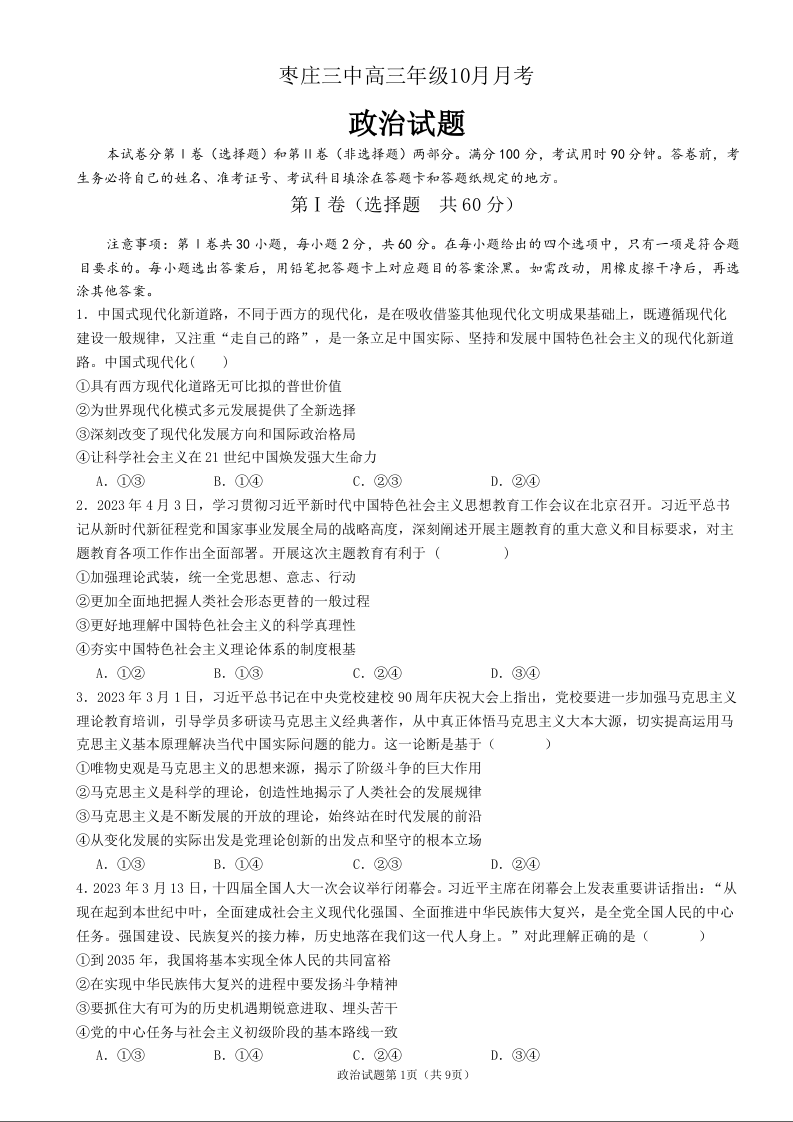 山东省枣庄市第三中学2024届高三上学期10月月考政治+答案
