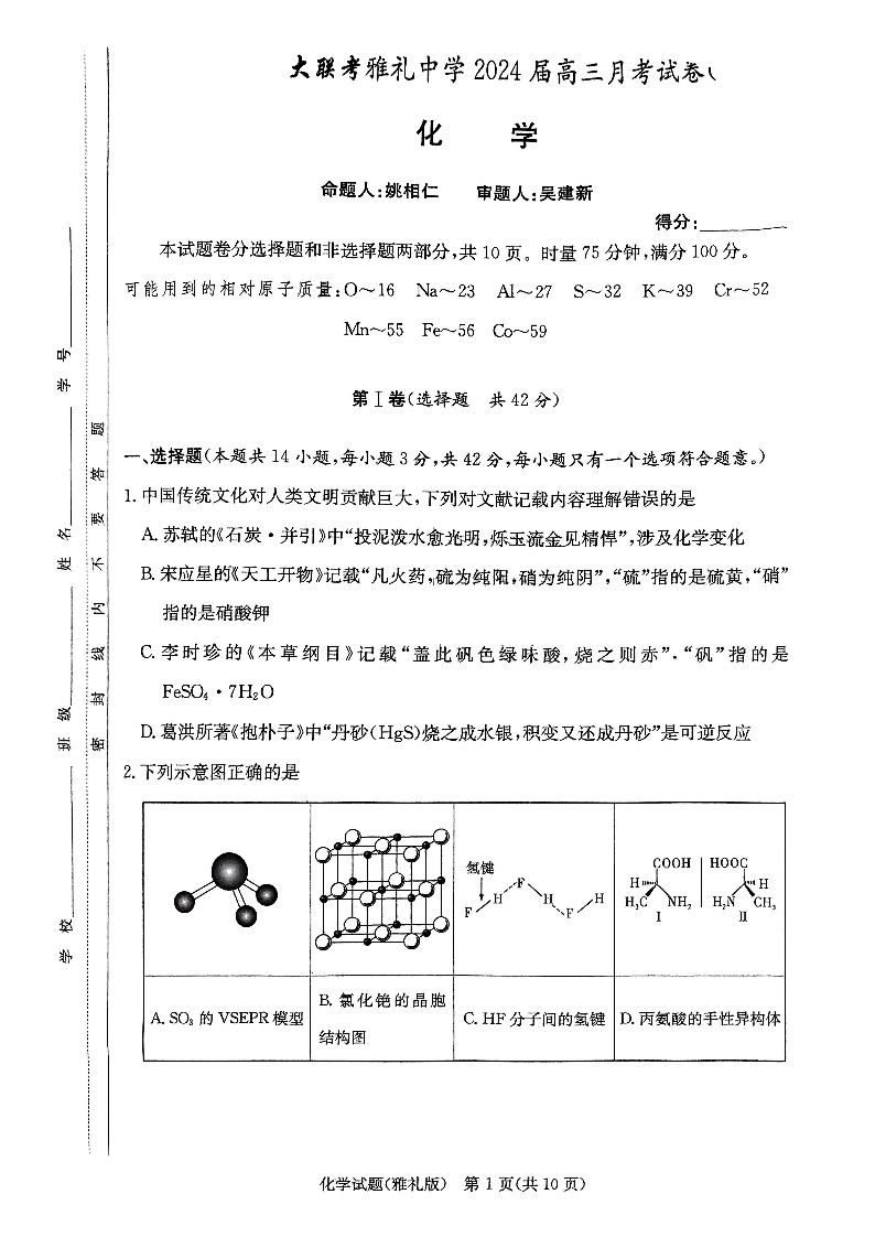 湖南省长沙市雅礼中学2024届高三上学期月考(一)化学