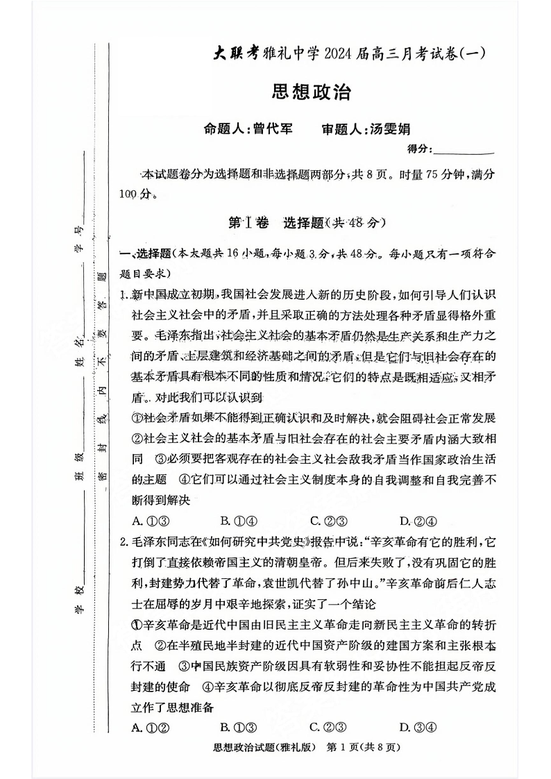 湖南省长沙市雅礼中学2024届高三上学期月考(一)政治