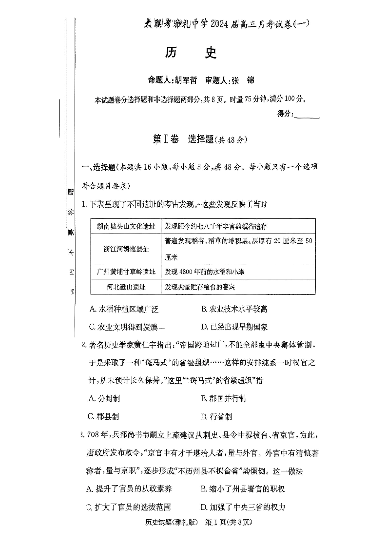 湖南省长沙市雅礼中学2024届高三上学期月考(一)历史