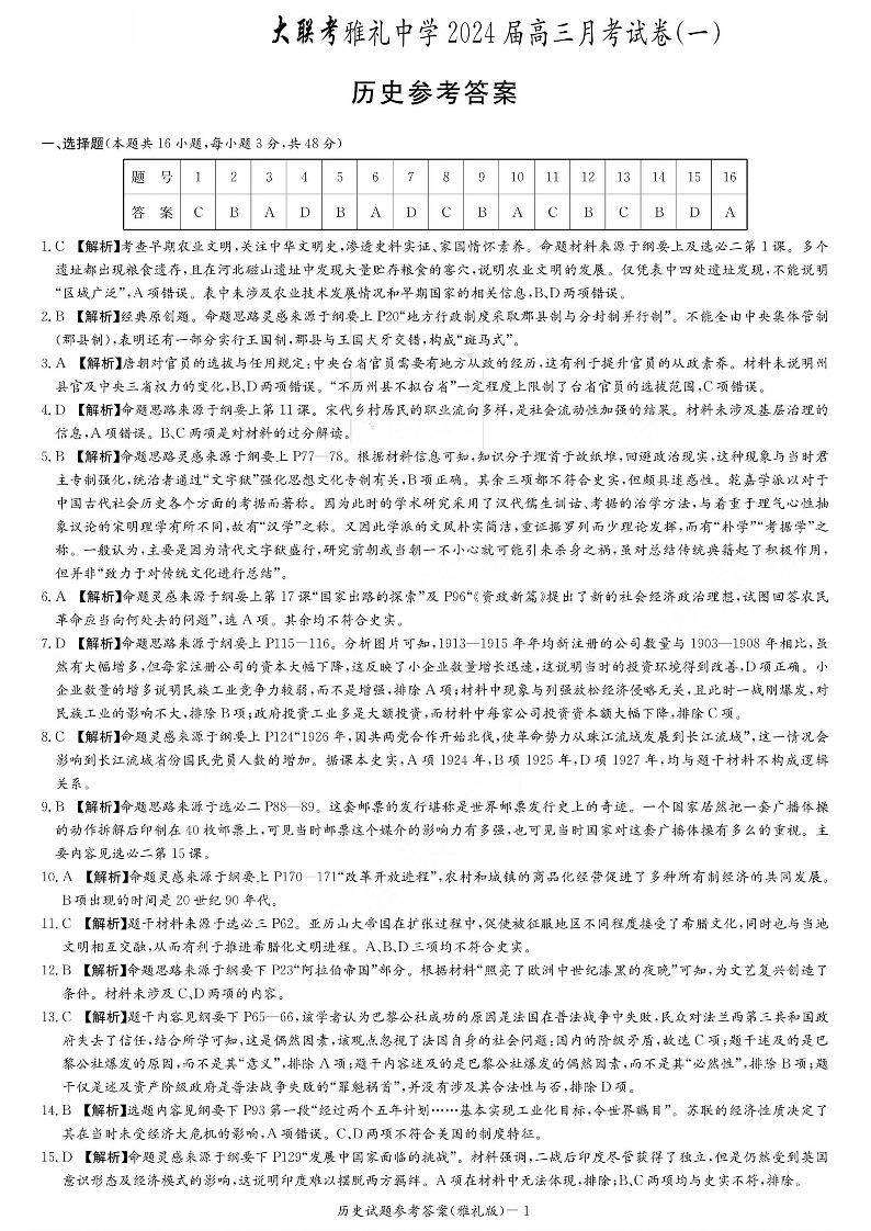 湖南省长沙市雅礼中学2024届高三上学期月考(一)历史答案