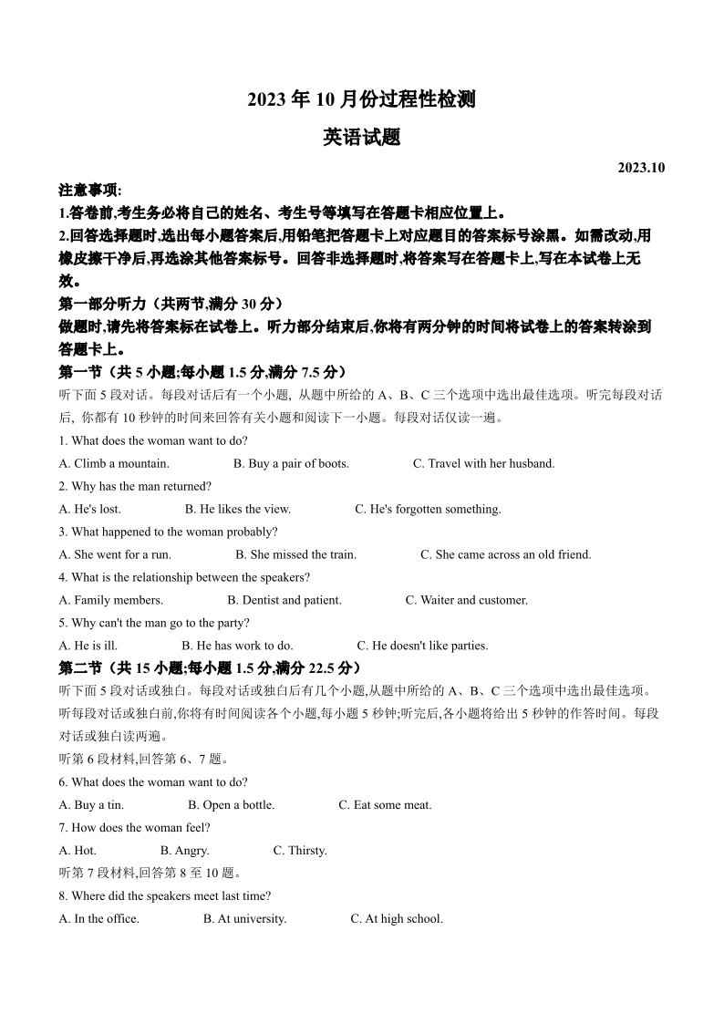 山东省潍坊市2024届高三上学期10月过程性检测英语